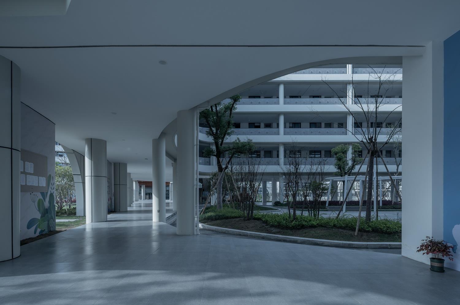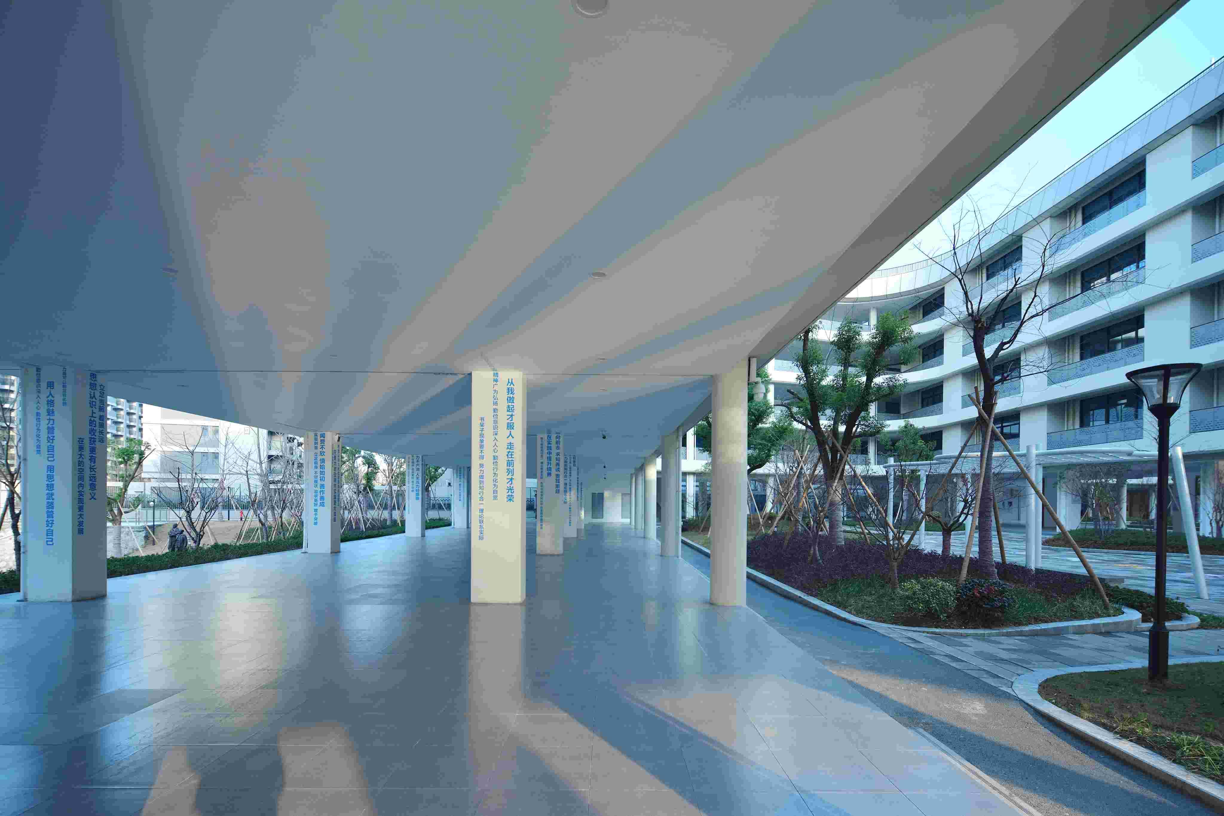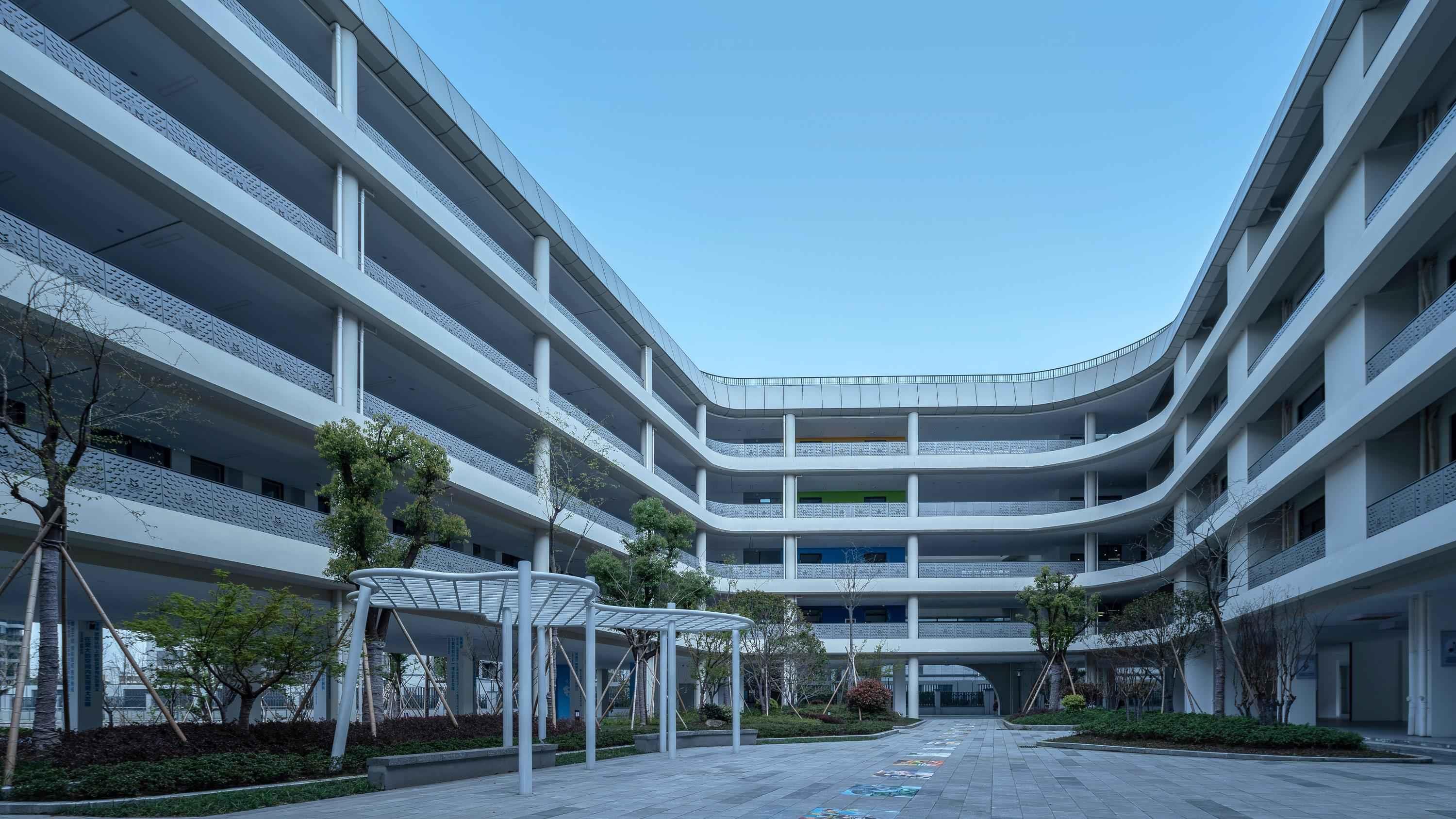 21世纪,社会与科技高速发展,为城市扩张提供动能。 在城市轮廓不断延伸的同时,挤压内在空间,使城市空间密度日渐饱和,二者矛盾凸显。而学校作为人类社会和教育的产物,以固定的场所和特定模式发展延续至今,鲜有创新和升级。 在城市高密度发展的时代背景下,如何在有限的资源和环境下,创新设计思路,尝试新维度空间设计,兼顾空间功能、素质教学及师生需求,平衡城市与校园发展,是新时代校园设计的重要课题与挑战。 杭州之江实验中学规划为48班中学,位于之江度假区单元,地理位置优越,环境优美,依山傍水,且富有浓厚的人文气息。 项目总体风格结合钱塘江文化,充分呼应板块战略与城市特征,采用先进性校园建设的设计理念,打造一座适应教育现代化、教育改革和发展的新型教育综合体。