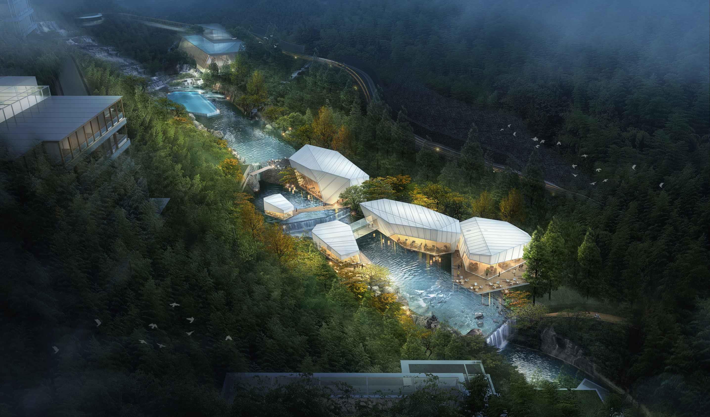 本项目位于浙江北部,湖州市德清县莫干山镇,处长三角腹地,环境优美,交通便利,旅游资源丰富。 项目所处位置极具自身特色,山谷纵深狭长,四周是绵延的山脉,每个地块与山谷有良好的视线联系。本项目设计采用“一环一谷”的规划结构,以山地峡谷为主要轴线展开公共活动序列和峡谷景观带;同时利用四周山地的视线优势和私密性组织客房形成外环,保持相对独立的同时加强山地和峡谷景观的活动和视线联系。将用地分为三类,分别为一类景观用地(位于山上,拥有远景、中景、近景,可观远山和云海,近处湿地田园)、二类景观用地(位于山上,拥有中景、近景,可观内部峡谷、对侧坡地竹林)、三类景观(位于山谷,近景为主,可观峡谷坡地、水塘等,景观可达性、互动性最强)。本设计将客房布置在一类、二类景观用地内,将酒店大堂等公共设施置于三类景观内,使客房拥有最佳的视线及私密性,公区有较好的景观可达性及互动性。